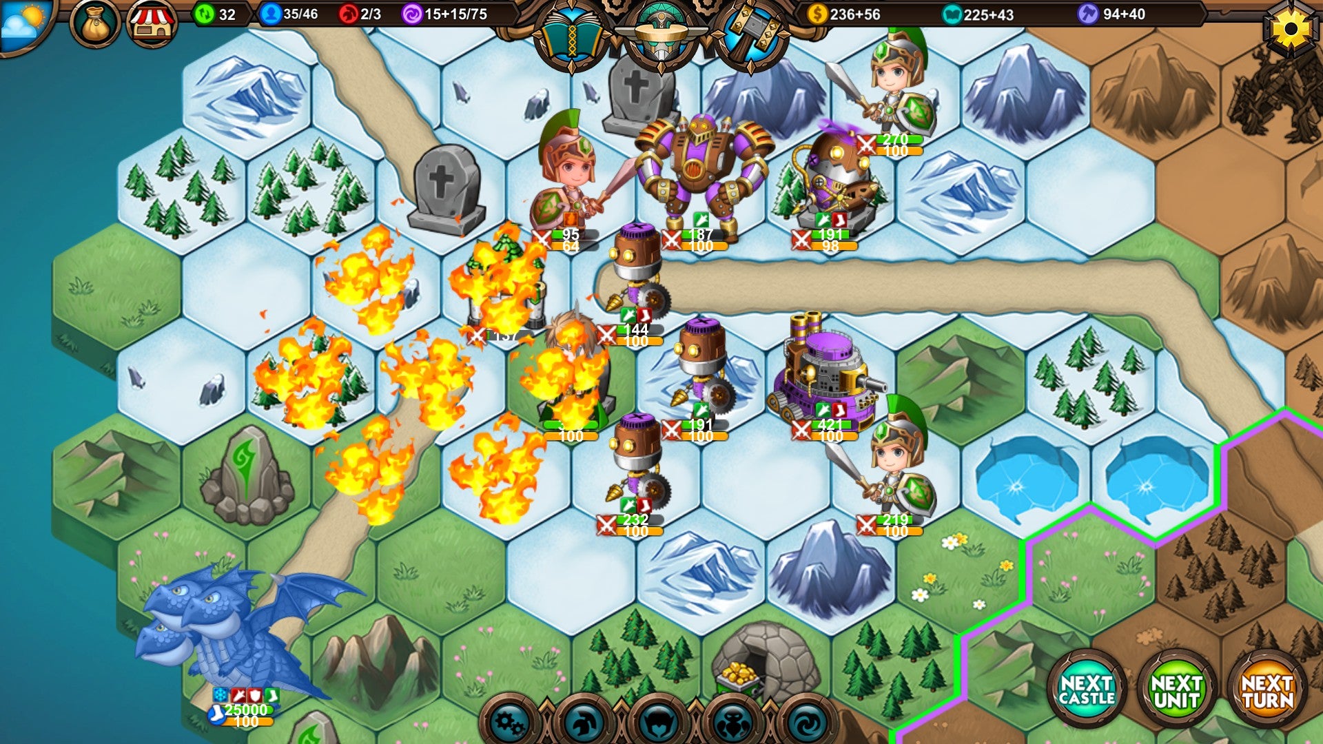 Where they capitalise on overwhelming and building momentum, the animal faction are more tactical, with troops that perform better when given a turn to cycle on the front line, and spells based around placing temporary totems on the map. The wood-and-brass robots are very expensive but hardy and able to self-repair, and more about positioning and map control, with spells that launch bombs and fire around to trammel enemies into position, and unit attacks that knock them around and into each other for extra damage. I mentioned spells a few times there, because that’s another layer still: each faction constantly generates mana too, to power its own unique set of spells, which can be upgraded with research points… or you can direct that research into military or economic upgrades instead.