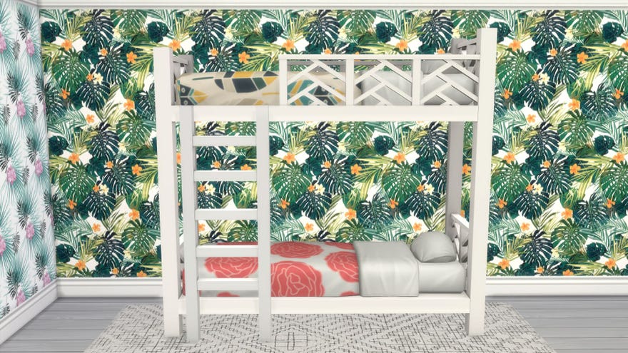 As well as the standard bunk bed set up illustrated in the header photo, you can use the loft bed and single bed together for a more unconventional set up, like below. On these bunks I’ve used the beds from Ravasheen’sTropic Like It’s Hotbeach house pack, which has its own functional bunk bed in a cool wood and rope design that is super good for beachy themes. The wallpaper you can see is also all from that set and I love it so hard. The rugs are also Ravasheen’s work.