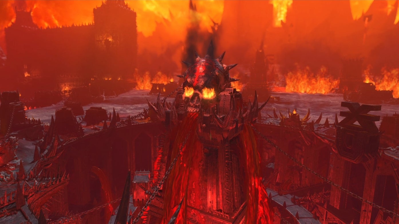 This realm belongs to Khorne, the god of pub car park fistfights, and consequently it is an eye-pummeling wasteland of flames and gore, strewn with brutal monoliths of red iron and vast, blood-chundering skulls. It’s so much richer and busier than any battlefield I’ve Total Warred on before, and I’m curious to see its sister locations in the realms of Tzeentch (bird-faced god of shitposting), Slaanesh (the artist formerly known as Captain Sex), and Nurgle (the master of bin juice). The realm of Nurgle, I force game designer James Martin to admit, has actual lakes of sick. It’s a far cry from Rome’s “tall grass” and “forest” terrain, eh?