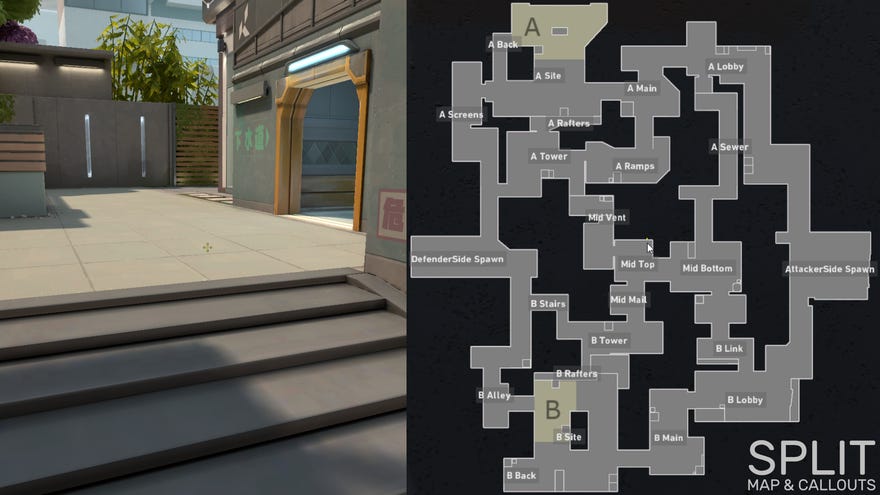 Below is the full map of Split, with all its callouts clearly labelled. Feel free to peruse the map at your leisure, before heading down below where we’ll talk about some of the interesting features of Split that make it stand out against the other maps inValorant.