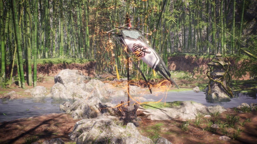 Head back to the pavilion and this time drop down onto the ledge to the right of the bridge, and once you’re in the river, look for some brown bamboo you can cut down. Follow this path and defeat the two Huoshu there to reach the second Marking Flag.